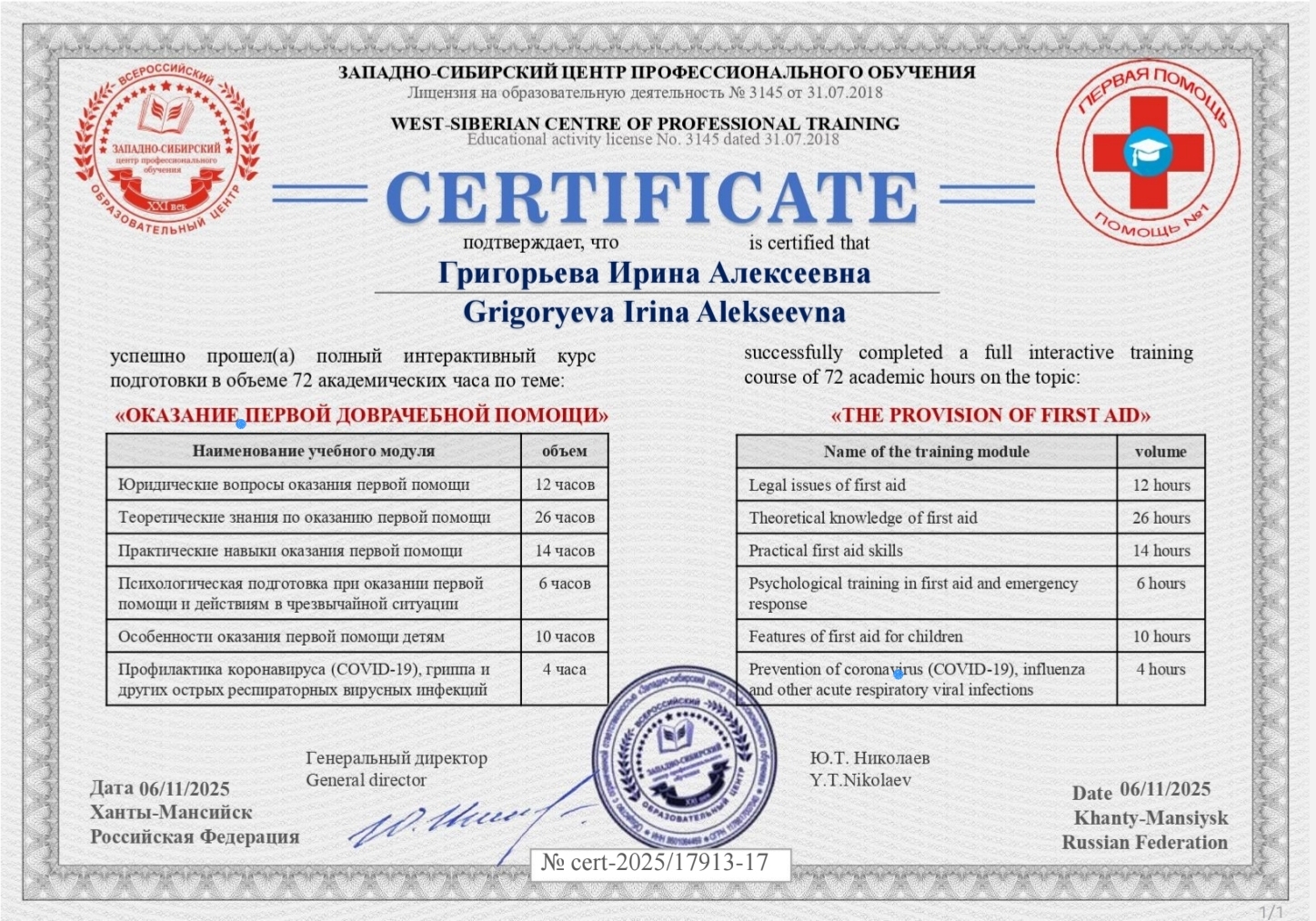 1) Курсы повышения квалификации по дополнительной профессиональной программе "Содержание работы учителя - логопеда и учителя - дефектолога в условиях реализации ФГОС ДО, ФГОС НОО обучающихся с ОВЗ" - 2020г.