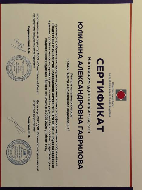 1. Прошла обучение по программе «Подготовка специалистов к проведению интерактивного занятия «Курс на здоровье» - декабрь 2025