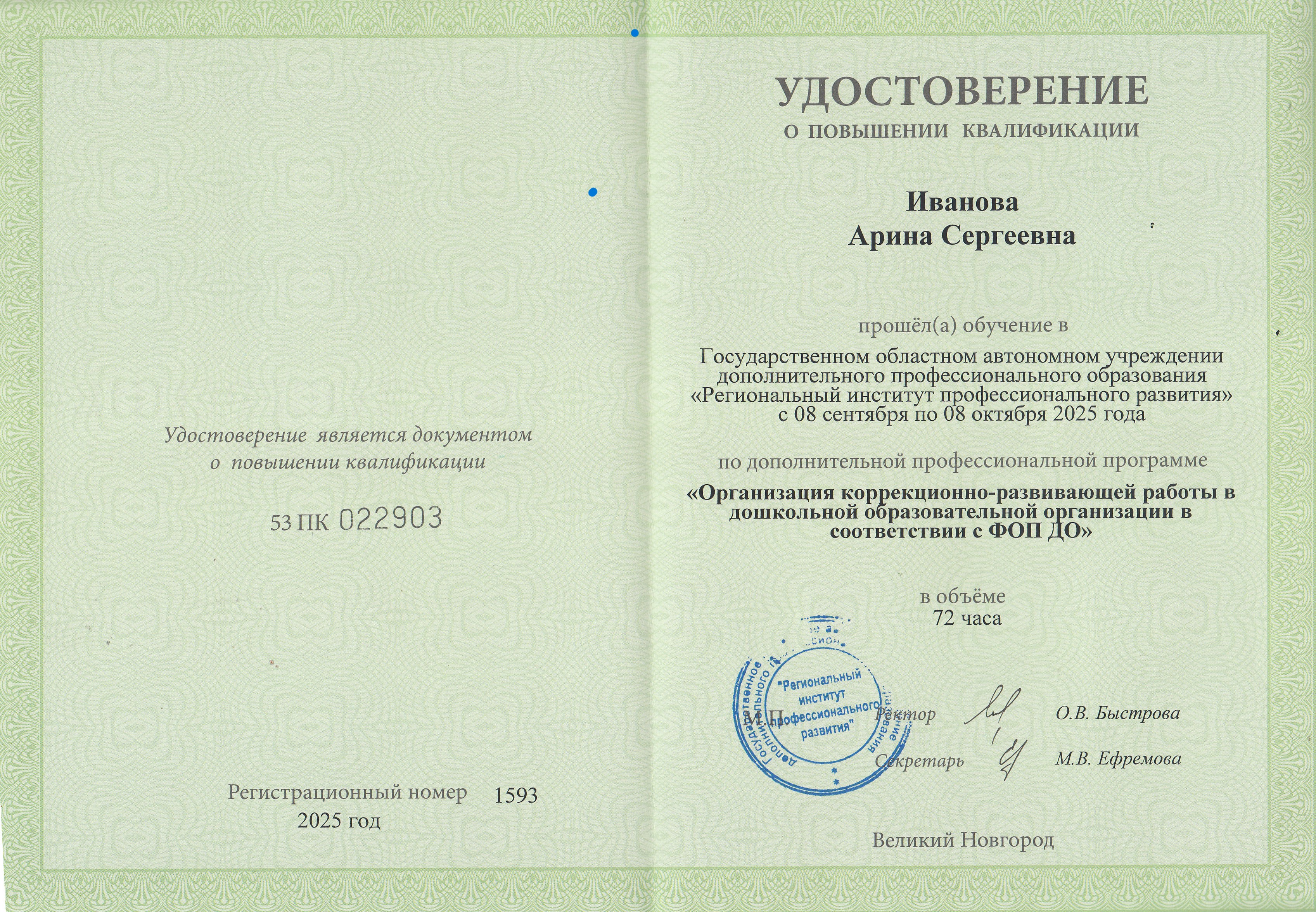 диплом о высшем образовании от 20 июня 2014 г - присуждена квалификация учитель- логопед, учитель- олигофренопедагог по специальности "Логопедия" с дополнительной специальностью "Олигофренопедагогика"