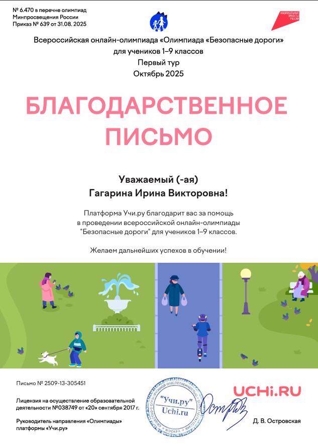 Благодарственное письмо за помощь в проведении Всероссийской онлайн-олимпиады на Учи. ру "Безопасные дороги". Октябрь 2025