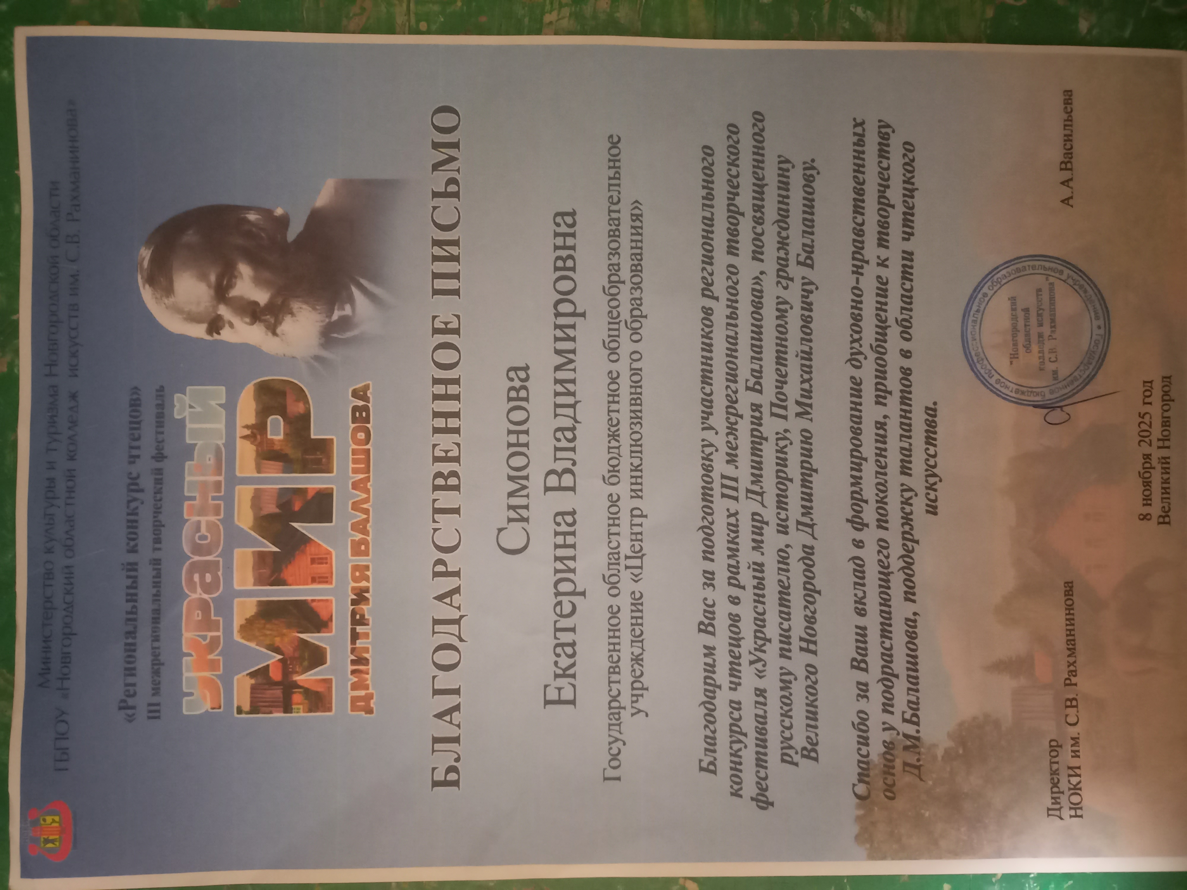 8. Благодарственное письмо Министерства культуры и туризма Новгородской области ГБПОУ "Новгородский  областной колледж искусств им. С.В.Рахманинова" ,"Региональный конкурс чтецов" III межрегиональный твоза подготовку участников регионального конкурса чтецов в рамках III межрегионального творческого фестиваля "Украиный мир Дмитрия Балашова", посвящённого русскому писателю, историку, Почетному гражданину Великого Новгорода Дмитрию Михайловичу Балашову. (ноябрь 2025)