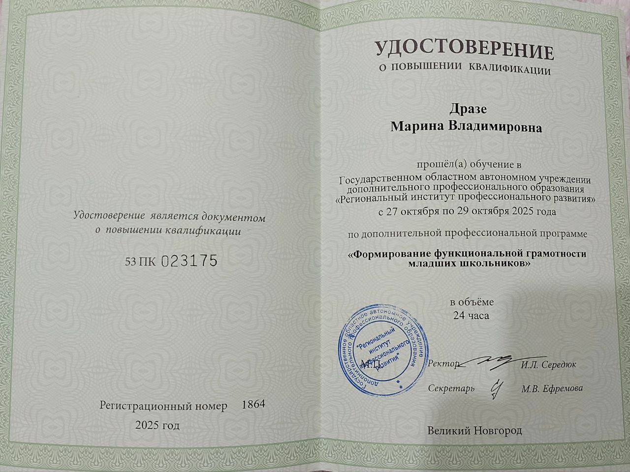 9.  «Формирование функциональной грамотности младших школьников» «Региональный институт профессионального развития» В.Новгород Уд. №2675 с 14.12 по 15.12.2021г. (16 ч.)