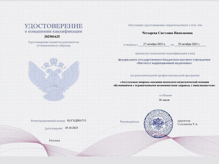В сентябре-ноябре 2023 году прошла обучение в Региональном институте профессионального развития по программе " Организация обучения и воспитания обучающихся с ОВЗ. ФГОС обучающихся с умственной отсталостью", в размере 72 часов
